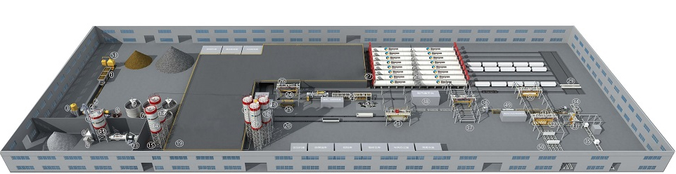 3、澆注工藝:采用固定澆注,模具移動到澆注攪拌機下方,接受澆注后,自動進入能夠控制濕度和溫度的養護室,加速胚體的硬化。